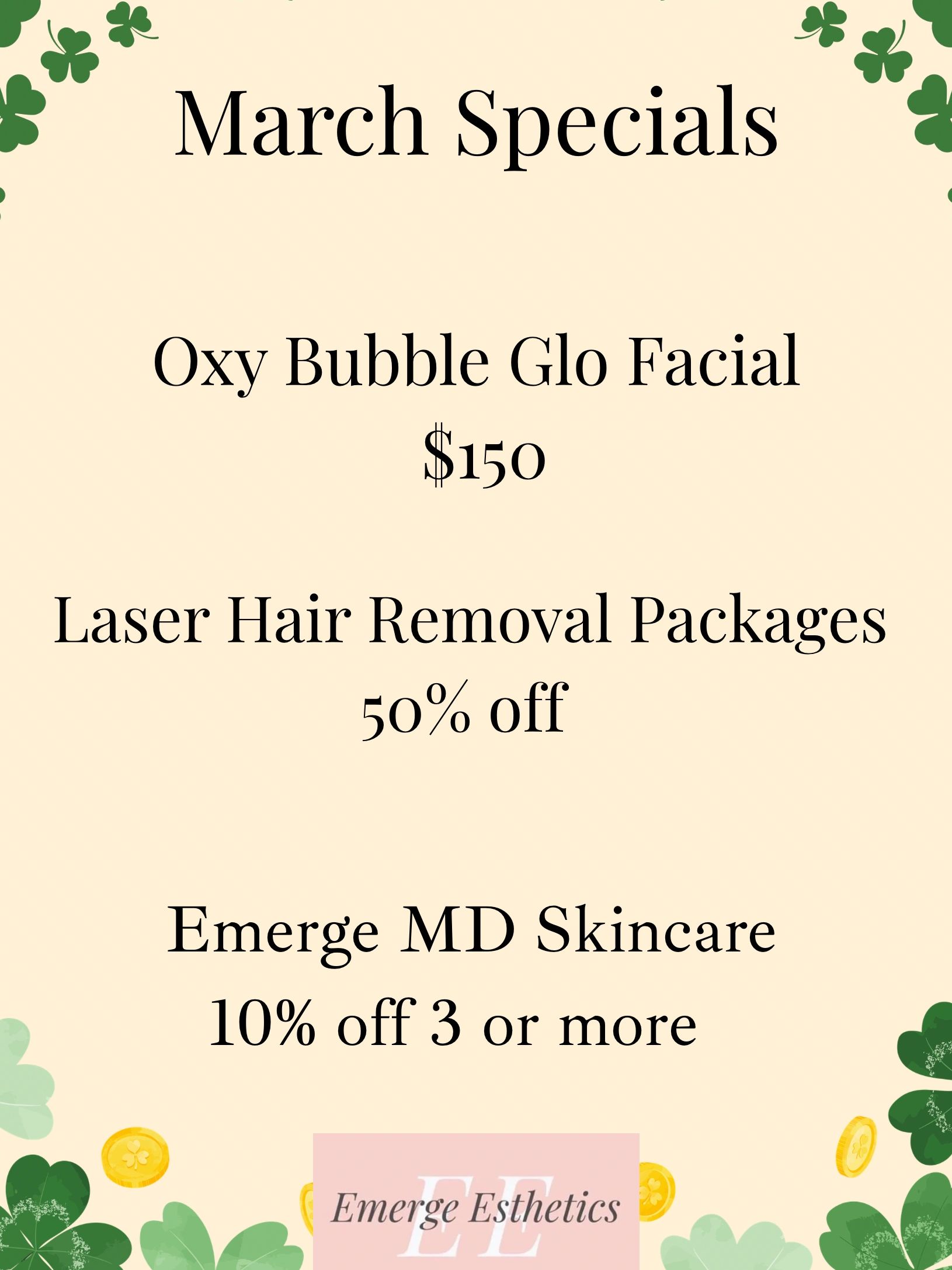 ☘️ March Specials ☘️ $150 Oxy Bubble Glo Facial 1/2 off Laser Hair Removal Pkgs