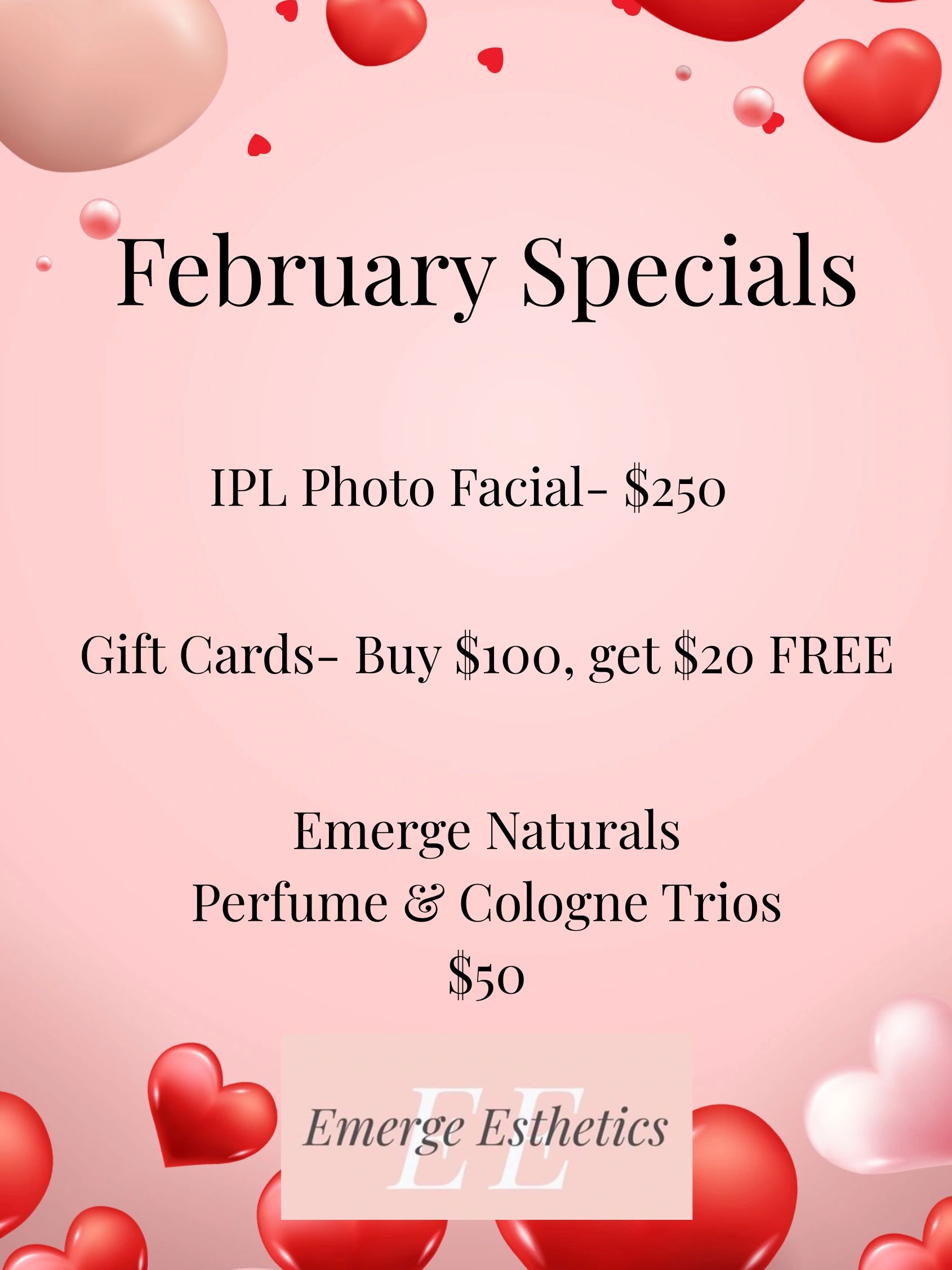 ❤️ February Specials❤️ $50 off IPL photo facials Gift Cards-Buy $100,get $20 & more